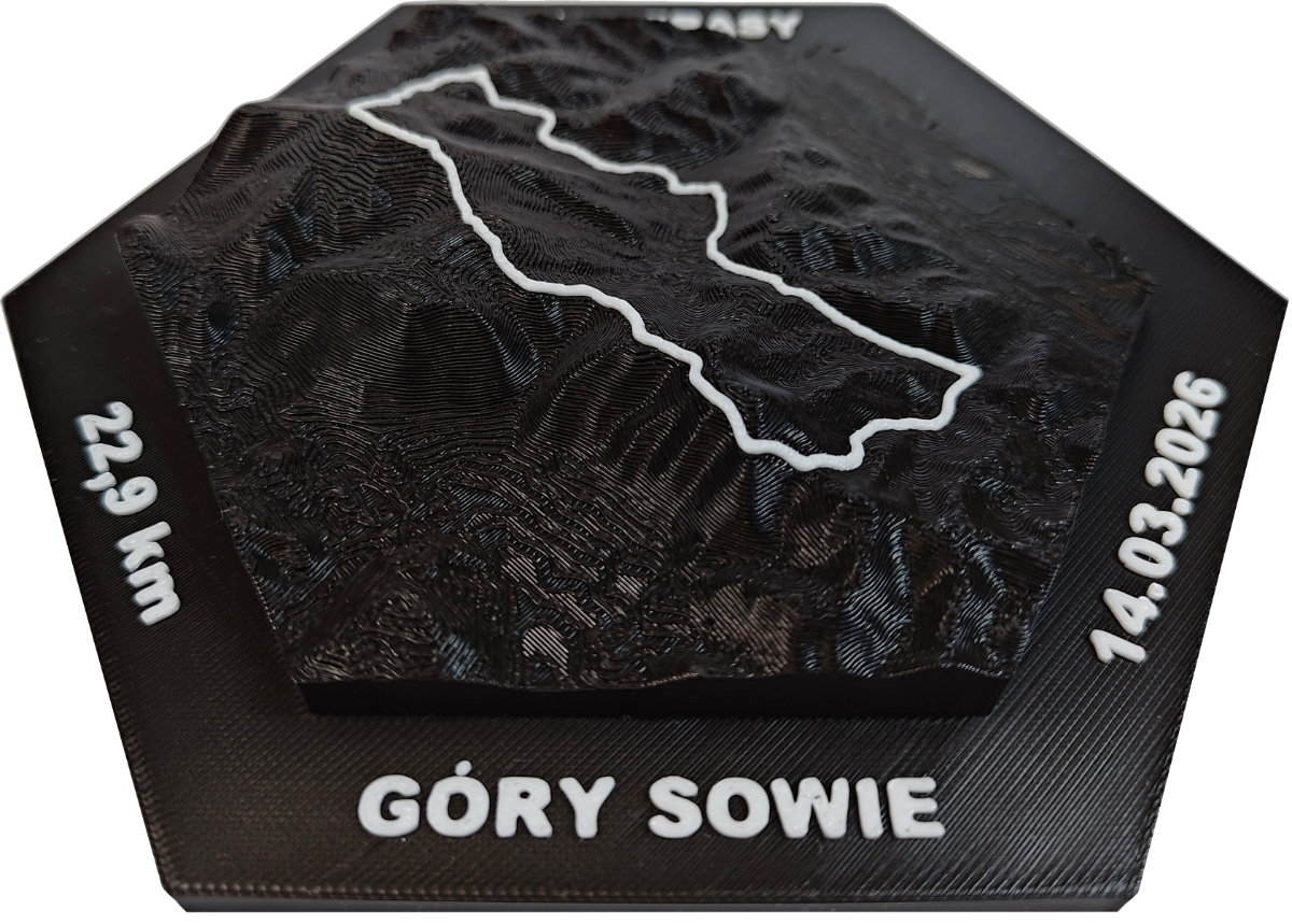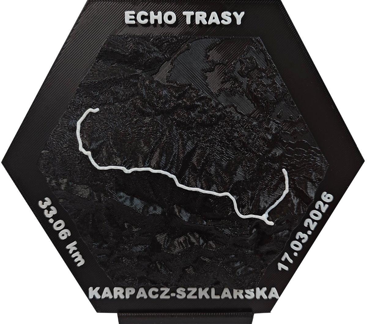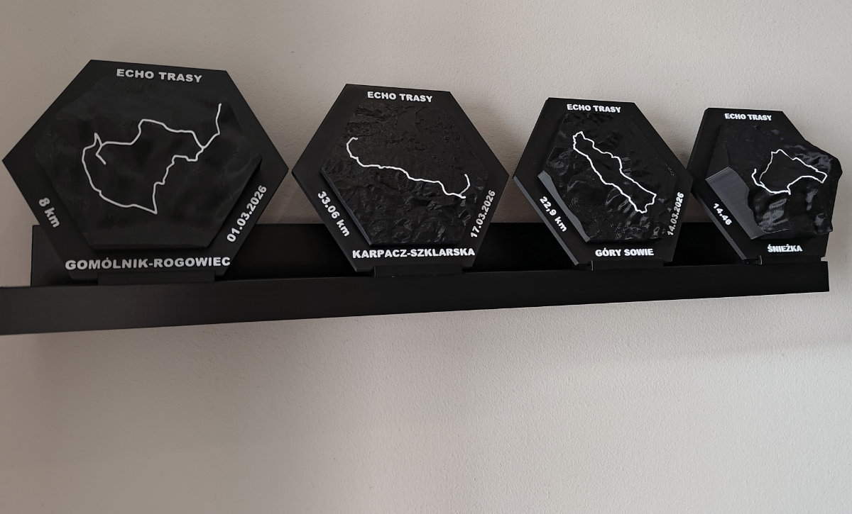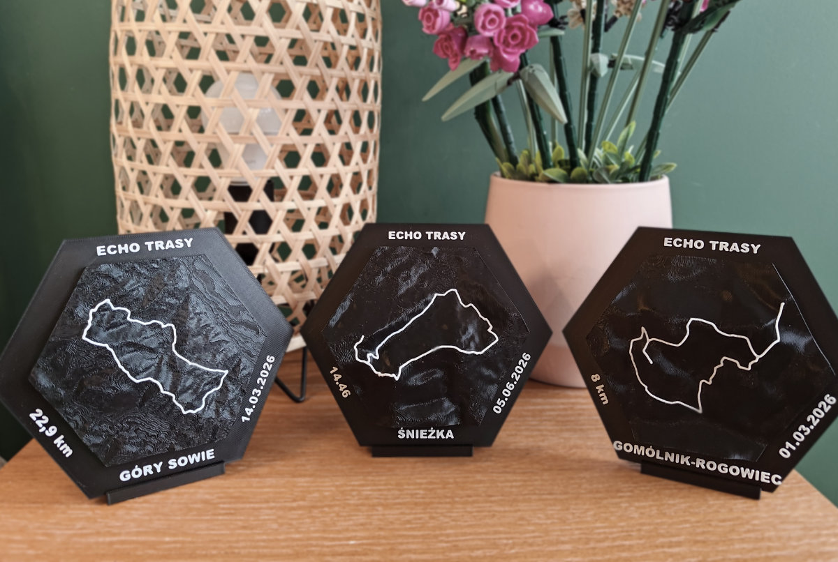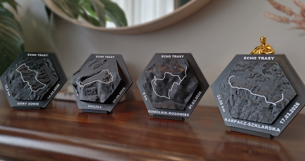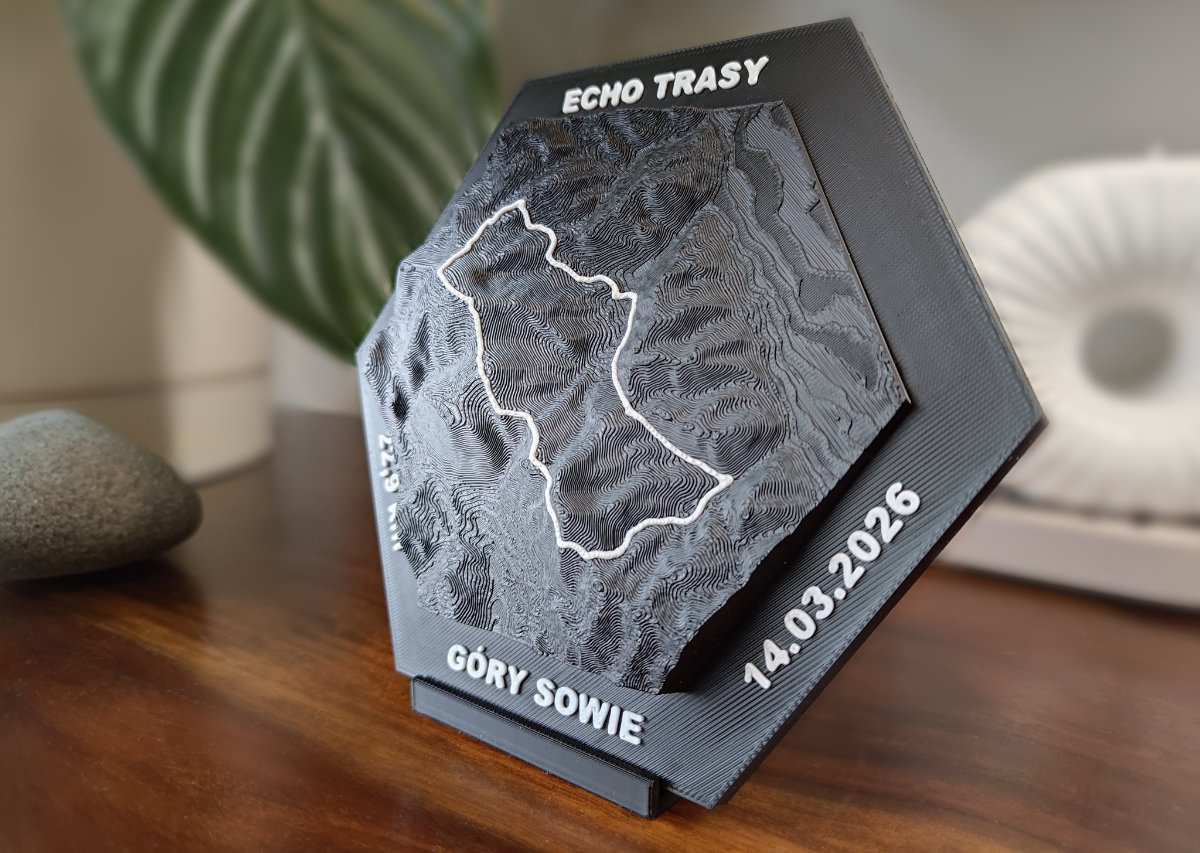 Echo Trasy to przestrzenna mapa 3D tworzona na podstawie Twojego pliku GPX. Relief terenu, przebieg trasy i najważniejsze informacje zapisujemy w formie eleganckiego heksagonalnego modelu.